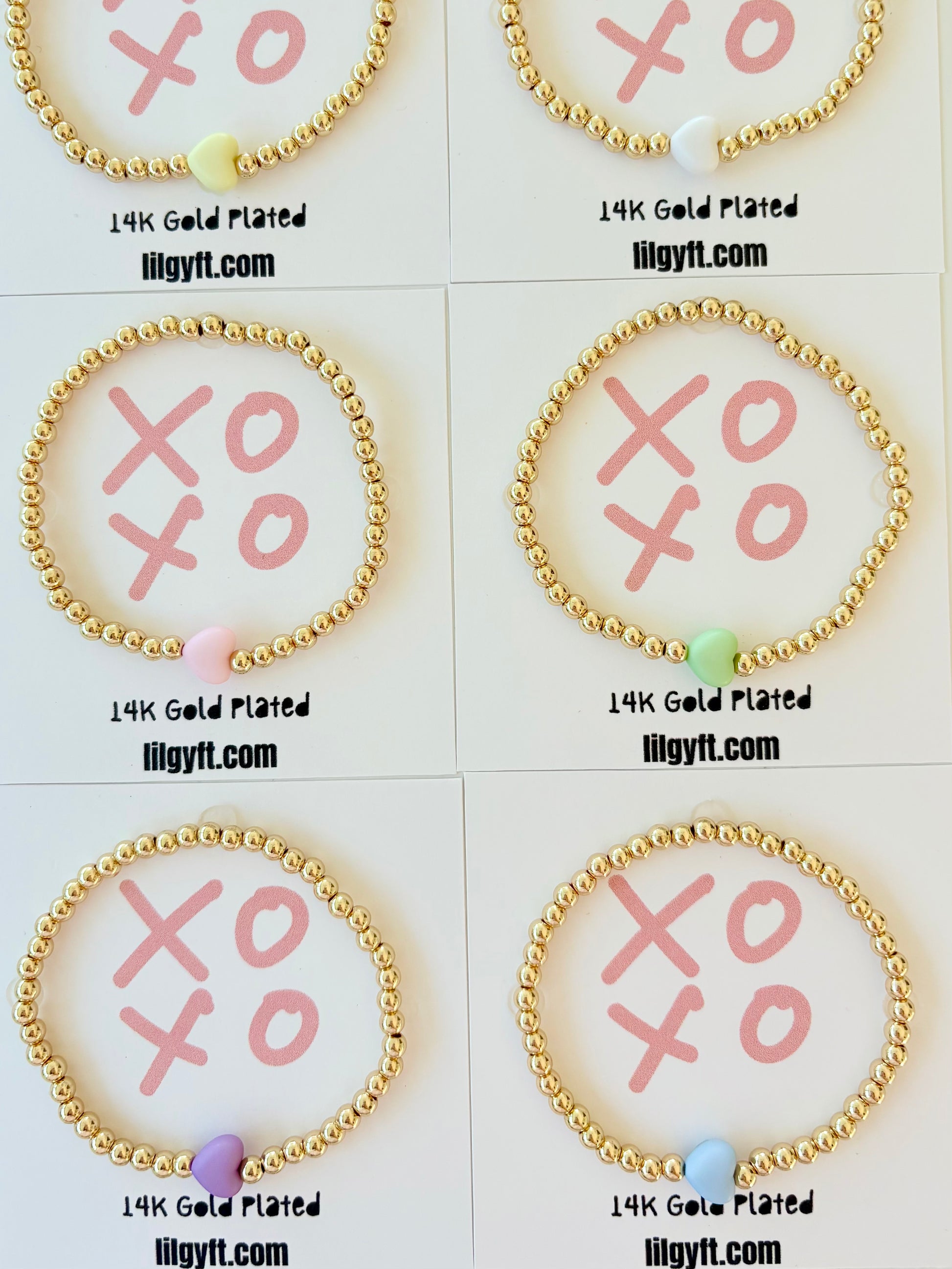 These bracelets are the perfect little gift for this Valentine's. Made with 14K gold plated beads with an acrylic heart beads on a stretchy elastic cord.